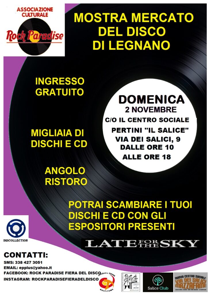 La prossima data della Mostra Mercato del Disco e CD per hobbisti a Legnano sarà Domenica 26 gennaio presso il Salice, situato in Via dei Salici 9. Manifestazione organizzata dall’Associazione Comitato Laboratorio di Quartiere Mazzafame, da Il Salice e dal Circolo S. Teresa Mazzafame in collaborazione con l’Associazione Culturale Rock Paradise.